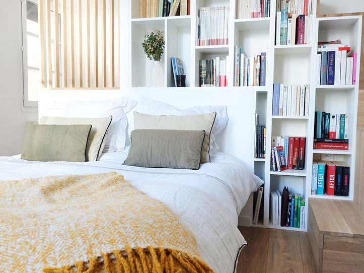 Optimisation : Nous avons créer et dessiné un meuble sur mesure 3 en 1, faisant office d'escalier, de tête de lit et de bibliothèque. Le tout dans des matériaux naturels, tel que le chêne massif.